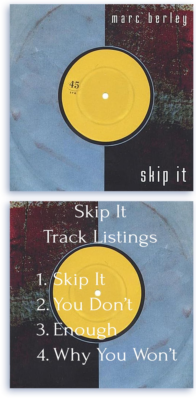 Marc Berley’s debut release SKIP IT EP grabs you from first chord and pulls you till the last. Feel-good Alt-Rock with a knack for infectious melodies, SKIP IT played at 150+ college radio stations from New York to California. It even charted – a great debut for any indie CD, especially an EP. From the classic raw rocker “Skip It” to the pop perfection of “Why You Won’t,” Berley displays an irresistible power and beauty that will get you lip-syncing in full public view. Get your lighter ready for the ride out of the ballad ‘Enough.’ You won’t want any of these songs to end. Berley’s music isn’t only catchy. It’s bold and original, straightforward and honest. Most of the time Berley won’t remind you of anyone, but you might imagine Green Day meets Tom Petty with the wit of Elvis Costello and the nerve of Nirvana. Berley was clinging to the stereo speakers before he could walk, singing melodies and banging out beats. From the way audiences react to his music, it’s clear that something fiery got into this New York City rocker early on, but Berley sums things up this way: “Guitar lessons at six, a switch to drums, and back to guitar. And so it went. Car radio. Years in bands. A life loving songs.” “I just try to write songs that will make people feel so good and so excited that they won’t be able to put the feeling into words,’ says Berley. ‘That’s what my favorite music does to me.” The playing throughout SKIP IT is marked by energy and taste. It’s Marc Berley on guitar and vocals, Joe Henderson on guitar, and Jeff Philips on bass. British drum ace Steve Holley (Paul McCartney) rounds out the band.
